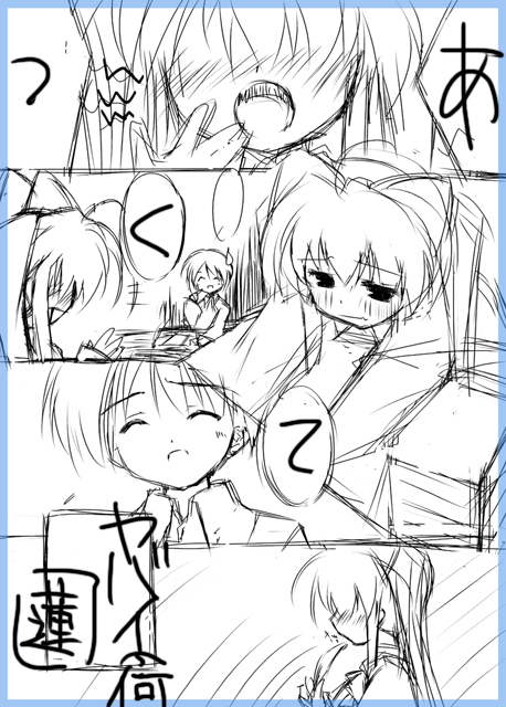 8月・9月・10月のイベントラッシュとか、無計画には気をつけましょう(。´Д⊂) マジハイ原稿からラフをペタリ。 ちなみにお話は夏発行の合同誌「ANOTHER STORIES」とちょろっとリンクしてたりします。 ヌルイとか言われないよう頑張りマウス!ヽ(≧∀≦)ノ 待望のエアリセ三巻が8/27ついに発売ですねw 一日千秋の想いで待ちましたよ!!(。´Д⊂) そんなワケで支援にペタリ。夏コミでエアリセ同人でないかなぁ…ww ***イベント情報*** ComicMarket72 8/17 東コ-55a RunaticMoon様にて委託参加 東方三月精本新刊出ます ▼クリックして貰えると頑張れます(`・ω・´)ゞ▼ ■WEB拍手■ | 委託店舗様