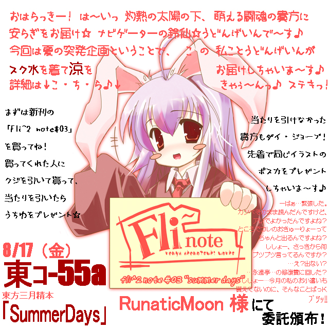 日頃サイトに足を運んでくれている方や、応援してくれる方の為にちょっとしたイベントを用意させて戴きました♪(人´∀`)゚+.゚ 今回うちの新刊をご購入戴いた方に先着順でクジを引いて戴いて、当たりの方には 見た目も涼しい スク水うどんげうちわをプレゼント♪ヽ(≧∀≦)ノ 『残念…っ 俺くじ運悪いんだよ…(´・ω・`)』な方にもまだチャンスがっ! ハズレてしまった場合にも、先着で同イラストのポストカードをプレゼントしたいと思います♪ 突発企画ですのでリアルに数に限りがございます(。´Д⊂) 品切れとなり次第イベントは終了となりますので、よろしくお願いしますm(_ _)m …だっておうち遠いんだもん(´・ω・`)ソンナニモッテイケナイ… 新刊表紙はこちらっ!ヽ(≧∀≦)ノ 東方三月精本・漫画・20P 全年齢対象・頒価400円 となっております。スペースは 8/17 東コ-55aRunaticMoon様にて委託参加! で、よろしくお願いしますm(_ _)m 後は15日夜に情報更新でラストになると思います。是非最終情報もチェックしてくださいねっ!ヽ(≧∀≦)ノ ▼クリックして貰えると頑張れます(`・ω・´)ゞ▼ ■WEB拍手■ マジハイ三学期が受かってると信じて原稿作業スタート!