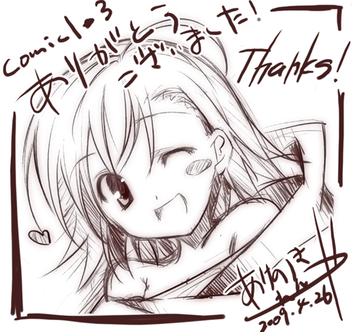 心配していた色紙プレゼントも無事成功させることができました! 次回もまた企画しますので、よろしくお願いします! ※今回出した色紙一覧 とある魔術・ラストオーダー けいおん!・澪 なのは・フェイト(子供ver) まりあほりっく・ゴッド エアリセ・シロ グリパケ・ノキア(女) イベントスペースにて見れた方、レア!(笑) スケブを断ってしまった方、ごめんなさい。 また次のイベントでも受け付けますので、ぜひ持ってきてください。 差し入れや温かいお言葉などたくさんありがとうございます。 これからも頑張りますので、よろしくお願いします! ▼クリックして貰えると頑張れます(`・ω・´)ゞ▼ ■WEB拍手■ PR ↓新刊情報は下の日記をご参照ください↓